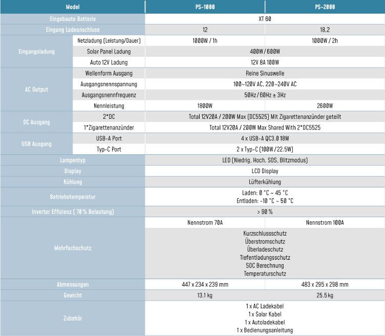 Die Gesamtausgangsleistung des Gerätes erreicht 1800 - 2600 Watt und deckt damit effizienten Energiebedarf verschiedener Geräte und gewährleistet eine stabile Stromversorgung in allen Anwendungen.