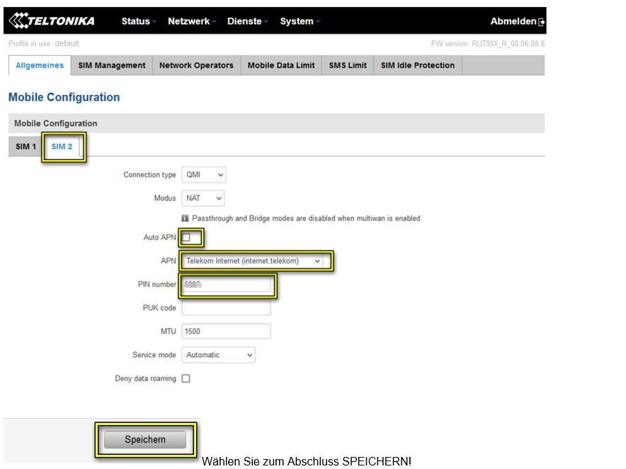 Jetzt können Sie noch zur Ausfallsicherheit den Haken bei den SIM Karten setzen. Fällt das WLAN aus, dann wechselt der Router automatisch auf die Haupt-SIM-Karte. Beenden Sie mit SPEICHERN.