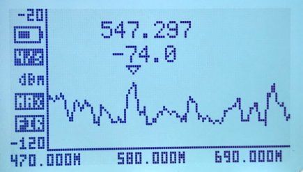 Zu den Screenshots: Der Marker zeigt automatisch den höchsten Wert und die zugehörige Frequenz an. Der Wert wird in dBm (Dezibel Milliwatt) angegeben. Die Werte sind negativ, da sie sich auf den Referenzwert von 1mW beziehen und als logarithmischen Wert ausgegeben werden.