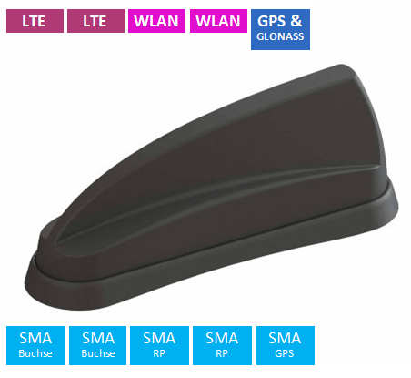 Die Antenne zeichnet sich aus durch 2 Empfangselemente für LTE/5G und WLAN, sowie ein Element für GPS/Glonass und Element für die o.g.