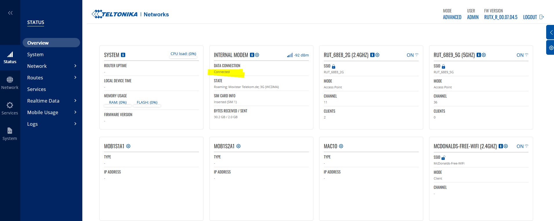 In der Hauptübersicht erkennen Sie unter STATUS und dort bei OVERVIEW an der Ergänzung des Wortes MAIN bei MOB1S1A1, dass der Router über Sim-Karte 1 in das Internet geht. Gleichzeitig erkennen Sie im Menüpunkt MODEM an dem Wort CONNECTED, dass die Datenverbindung ins Internet besteht.