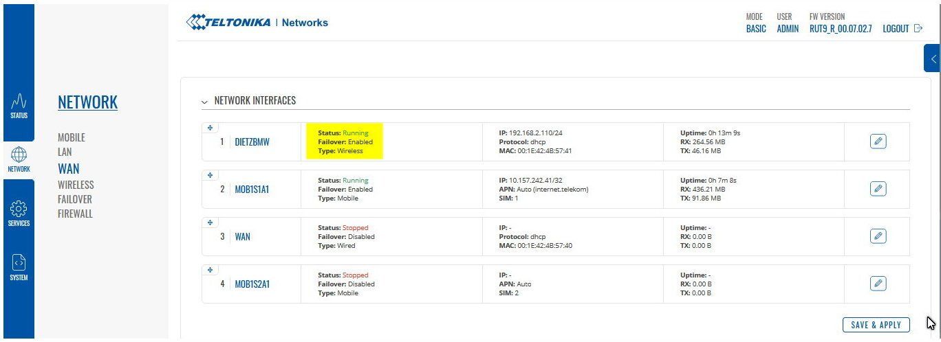 Jetzt können Sie im WAN Menü wieder umschalten auf SIM-Karte 1 durch hochziehen des Interfaces MOB1S1A1:
