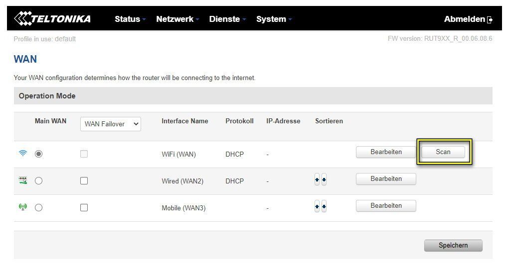 Wählen Sie hier in der 3. Zeile WLAN (WiFi WAN3) aus und SPEICHERN.
