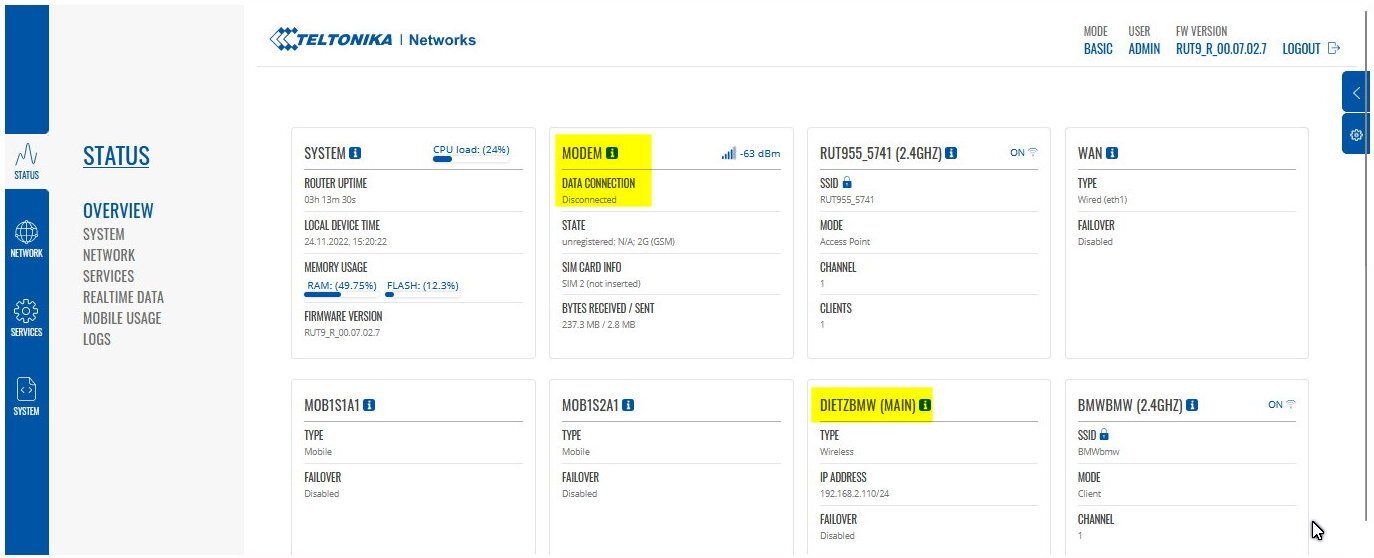 In der Hauptübersicht erkennen Sie unter STATUS und dort bei OVERVIEW an der Ergänzung des Wortes MAIN bei MOB1S1A1, dass der Router über Sim-Karte 1 in das Internet geht. Gleichzeitig erkennen Sie im Menüpunkt MODEM an dem Wort CONNECTED, dass die Datenverbindung ins Internet besteht.